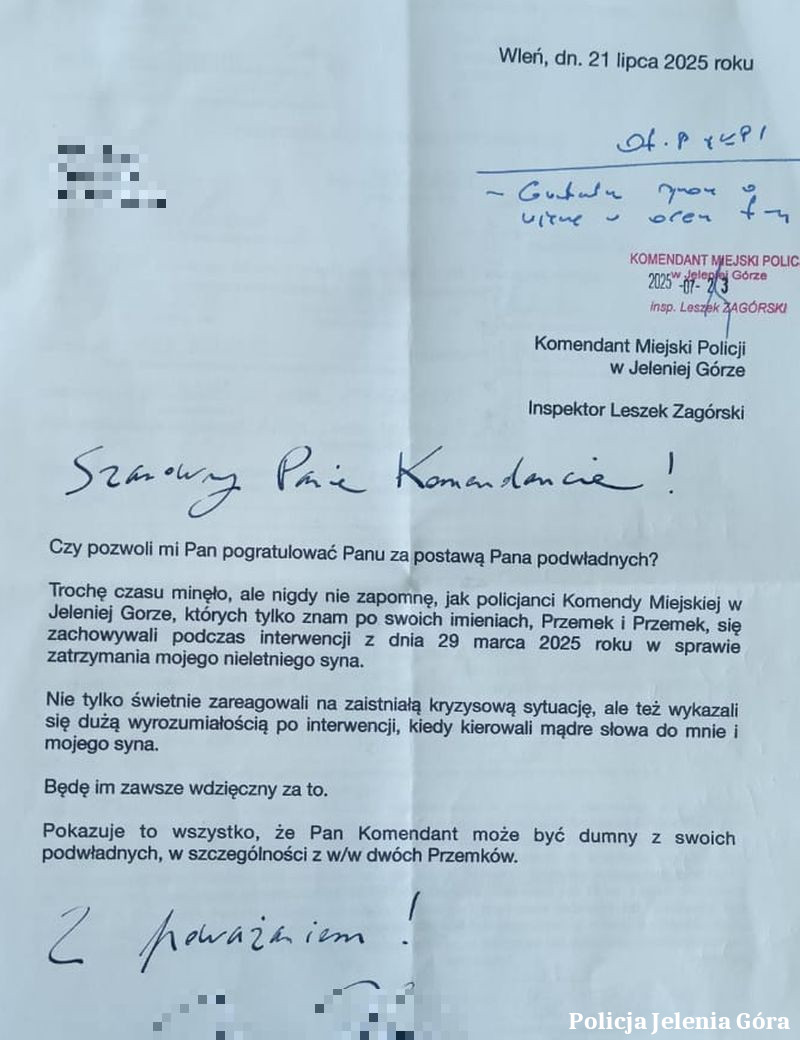W liście skierowanym do Komendanta Miejskiego, autor wspomina wydarzenie z dnia 29 marca 2025 roku, kiedy to mężczyzna zgłosił zaginięcie 14-letniego syna, który pojechał do Jeleniej Góry i kontakt z nim się urwał. Zaniepokojony ojciec niezwłocznie powiadomił służby. Tego samego dnia, w wyniku działań poszukiwawczych, funkcjonariusze sierż. szt. Przemysław Czaiński oraz asp. Przemysław Rogalski odnaleźli nastolatka całego i zdrowego.