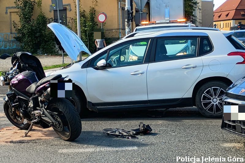 20 września 2025 roku policjanci pracowali przy dwóch zdarzeniach z udziałem motocyklistów. Pierwsze z nich miało miejsce w Jeleniej Górze na ulicy 1 Maja. 38-letni obywatel Czech, kierując motocyklem, podczas skrętu w lewo nie ustąpił pierwszeństwa przejazdu samochodowi marki Peugeot, którym kierowała mieszkanka Jeleniej Góry. W wyniku zderzenia motocyklista oraz jego pasażerka odnieśli obrażenia i trafili do szpitala. Badanie uczestników wykazało, że byli trzeźwi.