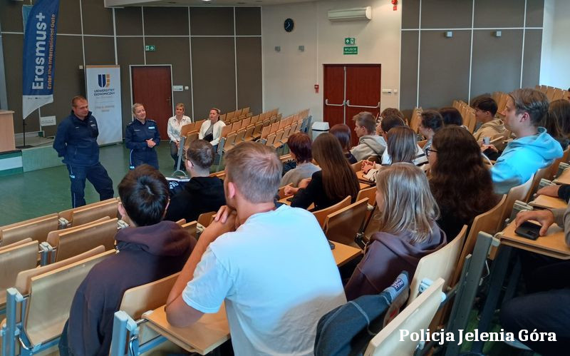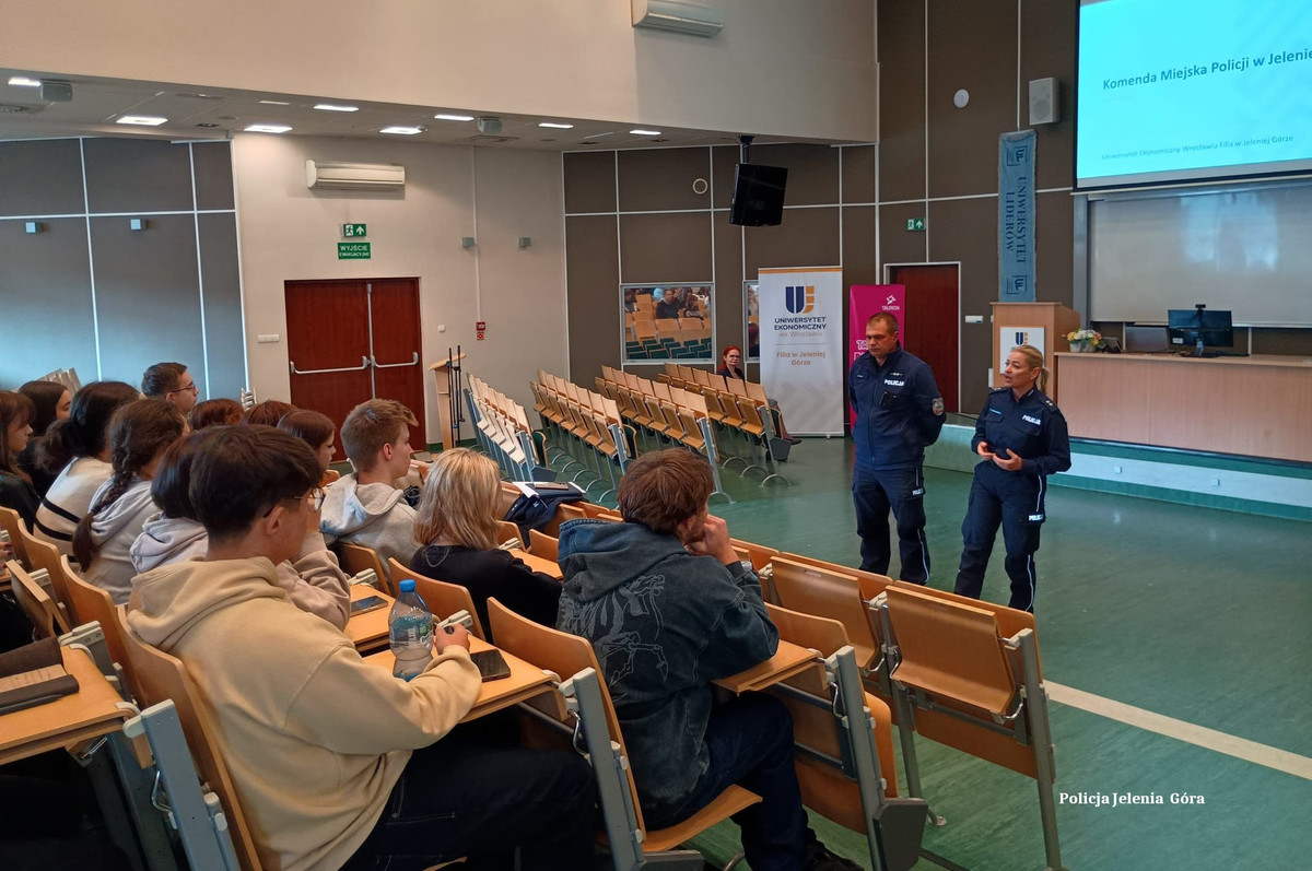 Policjanci z Komendy Miejskiej Policji w Jeleniej Górze 2 października br. brali udział w spotkaniu ze studentami I roku Uniwersytetu Ekonomicznego w Jeleniej Górze. W spotkaniu uczestniczyło około 100 osób. Policjanci rozmawiali z młodzieżą o potencjalnych zagrożeniach, oraz o tym, jak postępować, aby ich uniknąć.