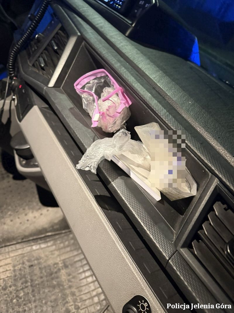 Mundurowi zatrzymali go do kontroli drogowej. Kierującym okazał się 27-letni mieszkaniec powiatu karkonoskiego, który podróżował z dwójką pasażerów -20-letnią kobietą oraz 38-letniego mężczyznę. Mundurowi wyczuli w pojeździe wyraźną woń marihuany. W trakcie czynności okazało się, że kierujący pojazdem może znajdować się pod wpływem środków odurzających, co wstępnie potwierdziło badanie testerem. W wyniku przeszukania auta funkcjonariusze w różnych miejscach znaleźli ukryte narkotyki. Łącznie zabezpieczyli marihuanę i amfetaminę, z których można uzyskać ponad 130 porcji handlowych.
