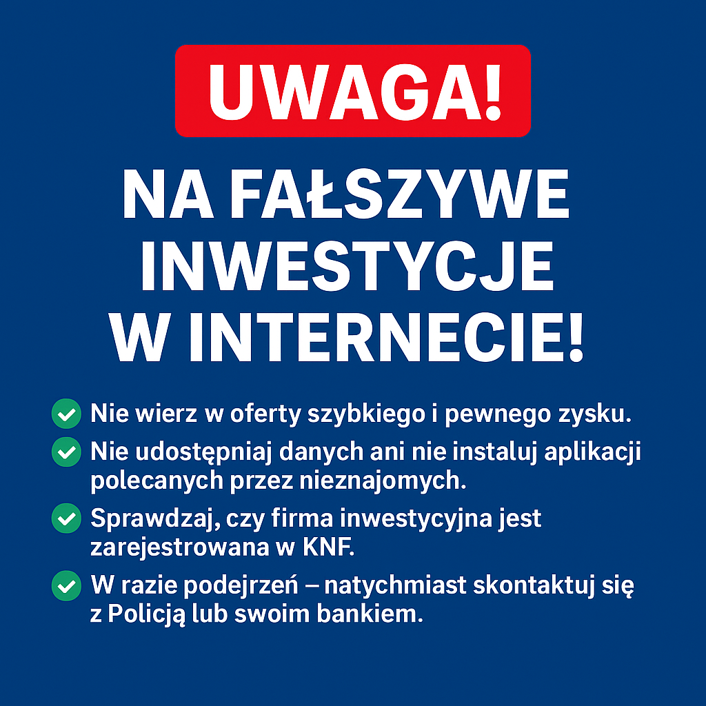Policjanci apelują, by nie działać pod wpływem emocji ani presji czasu wywieranej przez osoby oferujące inwestycje. Każde podejrzane ogłoszenie lub rozmowę należy traktować z dużą ostrożnością.