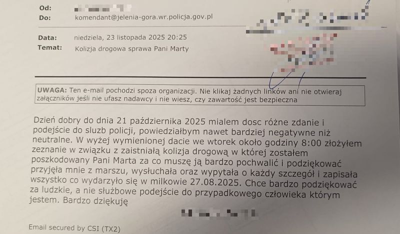 W swoim piśmie mężczyzna przyznał, że dotychczas miał „dość różne, a nawet bardziej negatywne niż neutralne” podejście do służb mundurowych. Jak jednak podkreślił, kontakt z policjantką całkowicie odmienił jego spojrzenie. Został przyjęty „z marszu”, bez oczekiwania, a funkcjonariuszka wysłuchała go z pełną uwagą, dopytując o każdy szczegół zdarzenia i skrupulatnie zapisując wszystkie okoliczności kolizji, do której doszło 27 sierpnia 2025 roku w Miłkowie.