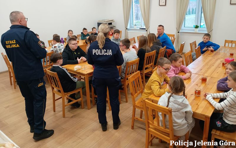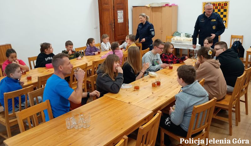 9 lutego 2026 roku policjantka Zespołu Komunikacji Społecznej Komendy Miejskiej Policji w Jeleniej Górze wspólnie z dzielnicowym z Komisariatu II Policji w Jeleniej Górze oraz strażnikiem miejskim odwiedziła dzieci spędzające ferie zimowe w Młodzieżowym Domu Kultury oraz w JCK Muflon w Jeleniej Górze.